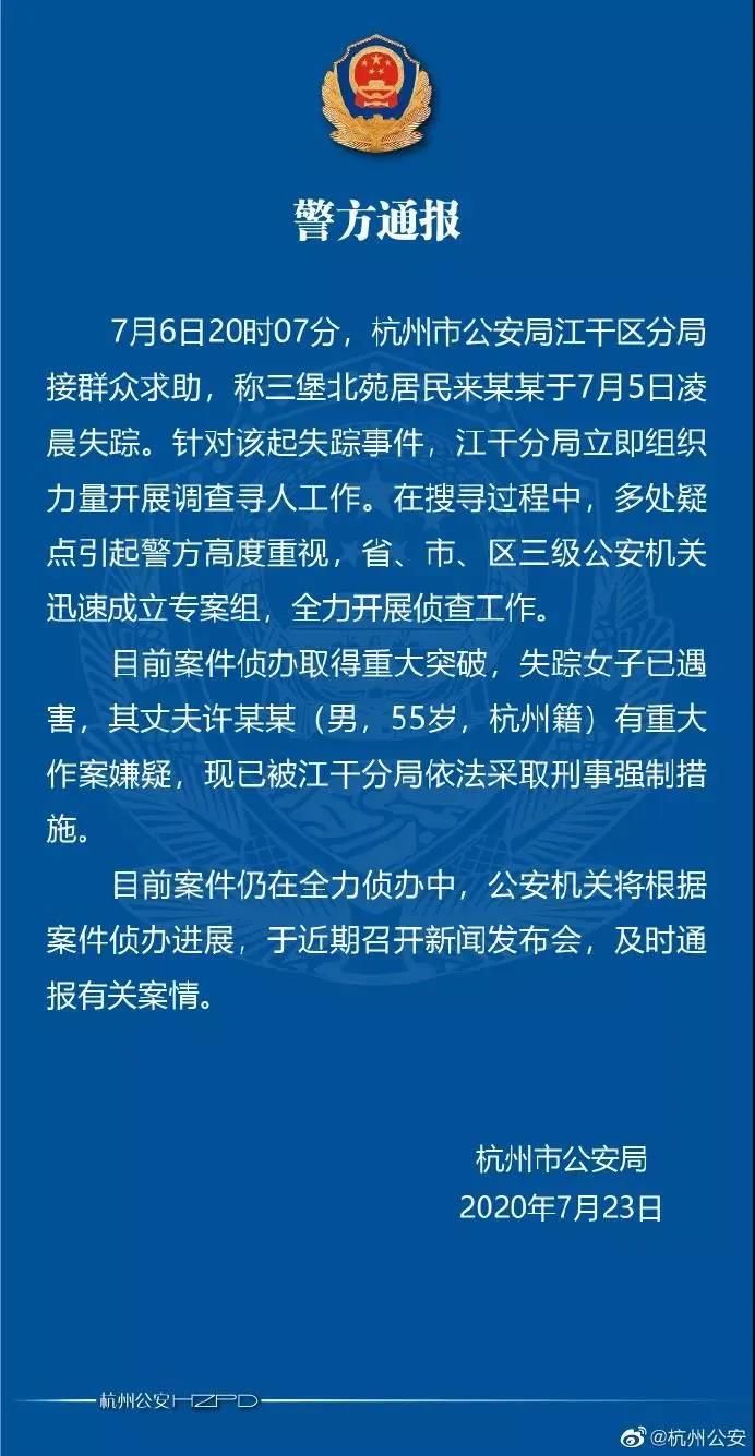 7月23日晚,杭州市公安局官方微博 @杭州公安 发布警方通报:杭州三堡北苑失踪女子已遇害,其丈夫许某某(男,55岁,杭州籍)有重大作案嫌疑,现已被依法采取刑事强制措施。详情>>