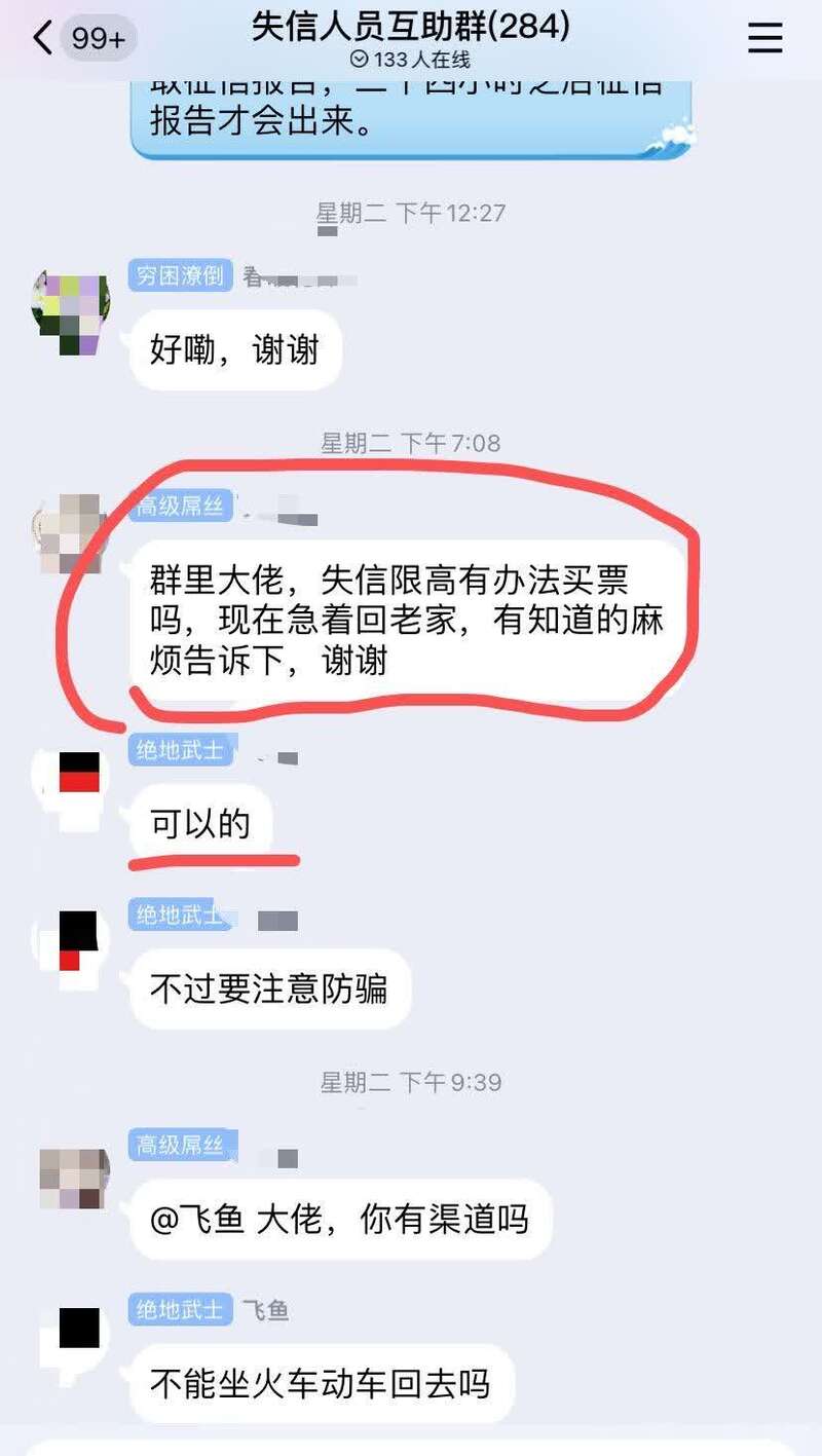 记者近日加入多个“失信限高人员互助交流”QQ群,其中有用户称自己作为股东没钱为公司偿还债务而被“限高”,也有多位用户称因借贷逾期被“限高”。这些“限高”人员,均对“出行限制”充满了担忧,以至于群中不时有人咨询“限高”人员如何乘坐高铁或飞机,也有人打出广告称可以解决出行受限问题。