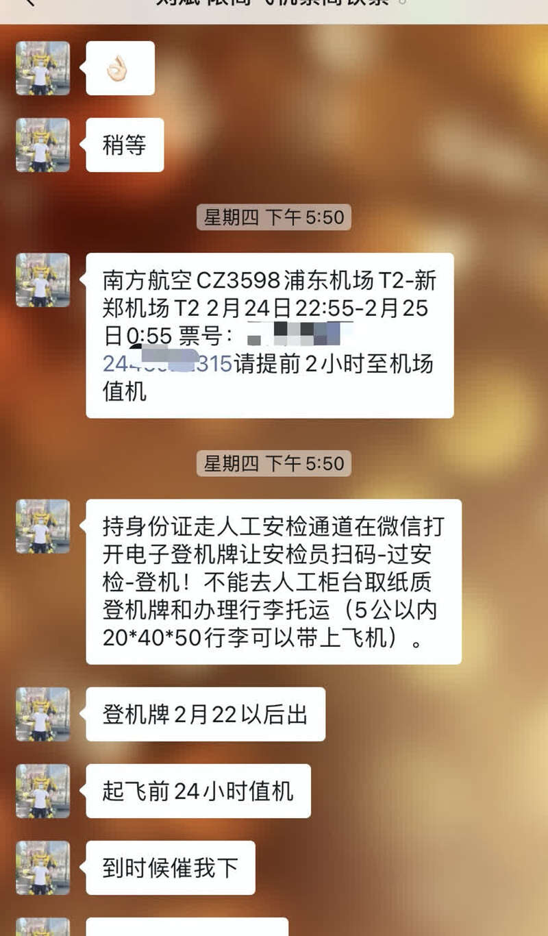 记者将前述一位“限高”人员的身份信息发给“刘斌”,并随机选择2月24日中国南方航空上海浦东至郑州新郑机场的一趟折扣机票。支付230元票价和300元手续费后,“刘斌”不到10分钟即为记者出票,发来包含电子客票号在内的航班信息。