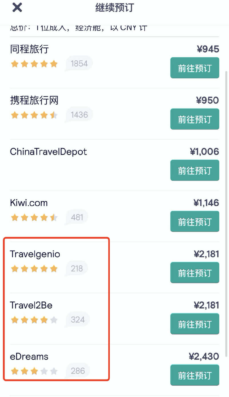 “滕大叔品牌运营”说,圈内“黄牛”一般从机票搜索引擎“iGOla骑鹅旅行”或机票比价搜索引擎“Skyscanner天巡”跳转到“Travelgenio、eDreams、Travel2be”等境外旅游产品服务商上订票。这些境外网站可以绕开国内的“限高”人员数据库,但缺点是全价票相对贵一些。“iGOla订票快,Skyscanner订起来麻烦,需要个把小时。”“滕大叔品牌运营”称,自己一般在前者为客户订票。