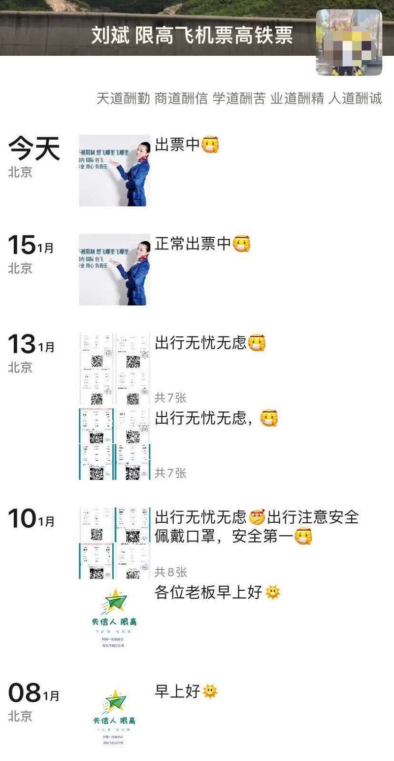 记者注意到,微信账号名为“刘斌-限高飞机票高铁票”的“黄牛”在网上发布广告网帖称,为“限高”人员提供订机票的服务。