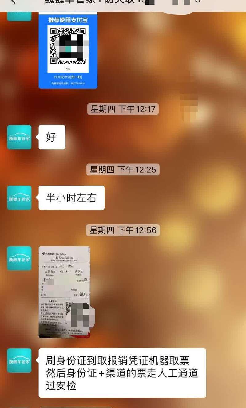 一番沟通后,记者支付214元,提供给对方一位“限高”人员身份信息,并随机选择1月21日上午合肥南至武汉的一趟高铁列车。
