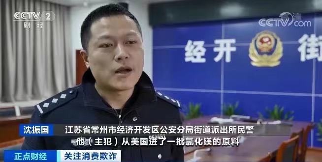 江苏省常州市经济开发区公安分局街道派出所民警沈振国说:主犯从美国进了一批氯化镁的原料,谎称大盐湖水“金能量”产品从美国进口的原料。实际上他拿回来之后,自己在网上购买了灌装机器、贴标签的机器,在自己家里的地下室。通过1:1勾兑的比例,直接装自来水,跟氯化镁混合、冷却之后,独自灌装。