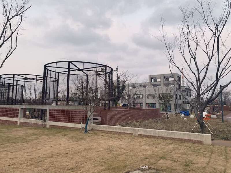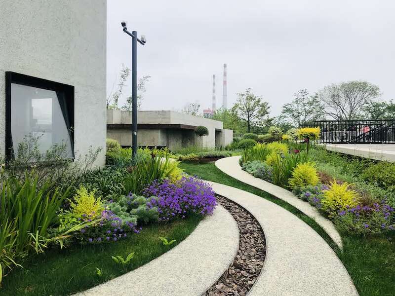 生物转盘池。设计师将白石与绿色碎玻璃混在一起,作为建筑的外立面,远观,安静且统一,近观,细腻的肌理混着年代的亲切感。
