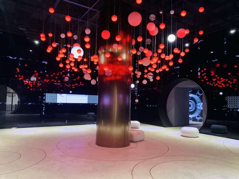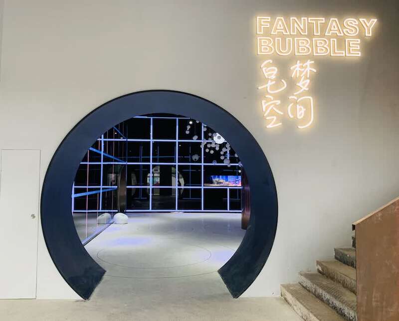 “筑皂”是“皂梦空间”的主展馆,摆在展馆中心的是一个巨大的视觉艺术装置——“源泉”。设计师以制皂的反应池为造型,工业管道顺着结构在上方纵横交错,游客可通过装置在四周管道完成吹泡泡的互动,带有芬芳气味的多媒体泡泡在四周棱镜的反射下,构成光怪陆离的泡泡世界。