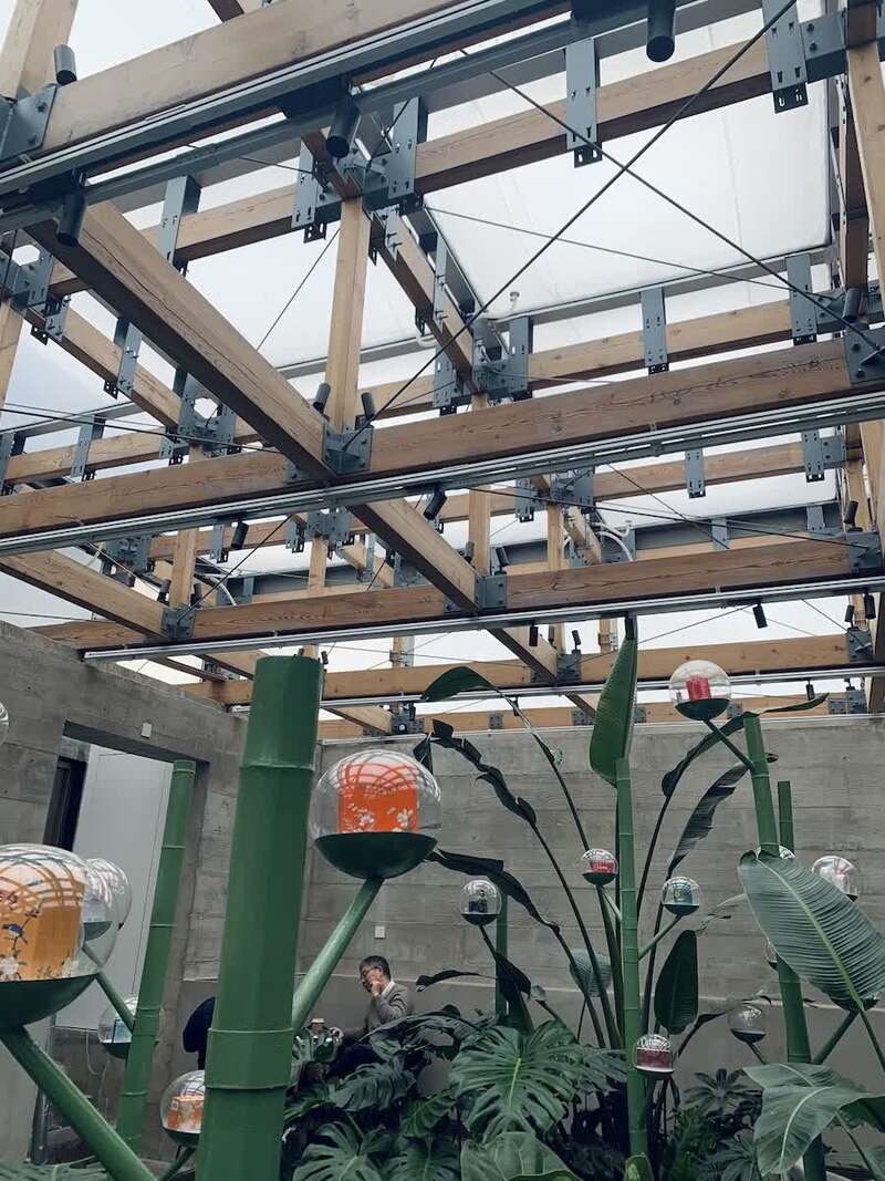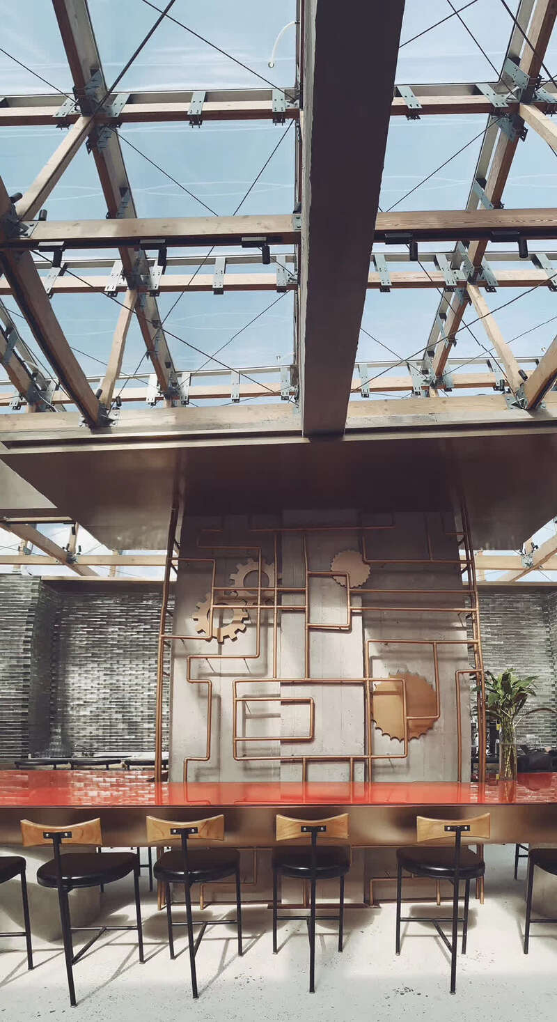 走进咖啡馆,与肥皂相关的元素就更加多了。主吧台和四周的墙壁上一个个圆形金属装饰,是用制皂设备的零部件制成的,颇有一些蒸汽朋克的味道。透明的卡座长椅勾勒出一个个半弧形的空间,仿佛一个浮在水面上的小气泡。过去连通不同生产池的圆形管道,被改造成连接咖啡馆不同空间的通道,再加上整个屋顶由半透明膜结构制成,像把人罩在一个巨大的泡泡里。