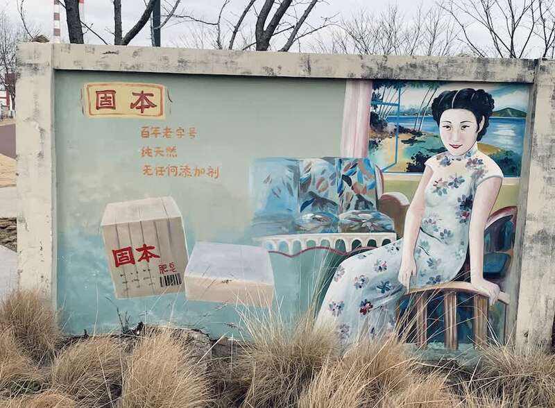 除了室内,室外空间也做了很多怀旧的处理,比如在一面做旧的清水砖墙上,刻有制皂厂的百年品牌的诸多名字:蜂花、固本、美加净、白丽、上海药皂等等。在咖啡馆旁的外围墙上,有好几幅“国营上海制皂厂”的老海报。还有一台“正在吐泡泡”的蓝色机器是过去制皂过程使用的压缩空气机。