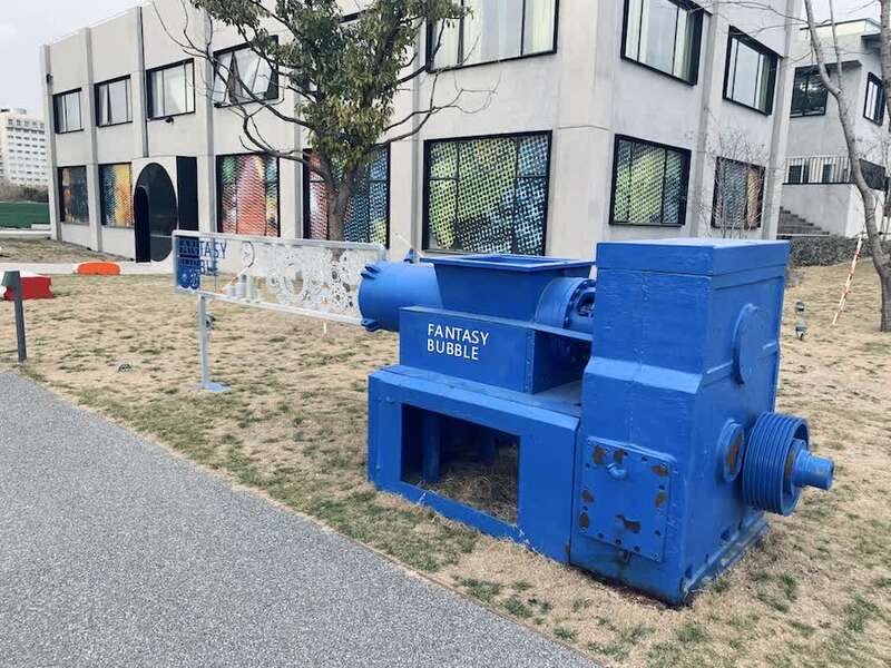 “正在吐泡泡”的蓝色机器是过去制皂过程使用的压缩空气机。