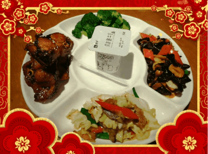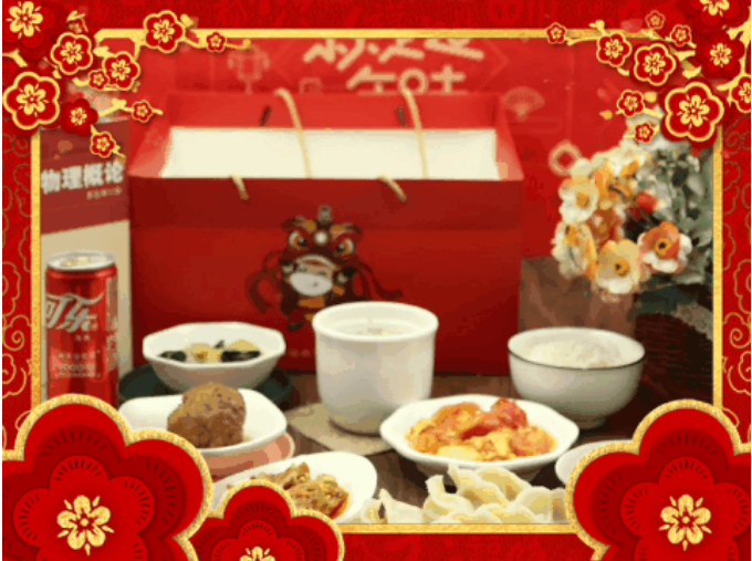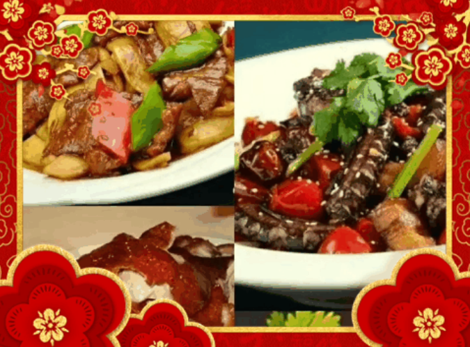 红红火火(红烧肉)、金带玉冠(尖椒小炒肉)、牛转乾坤(黑椒牛排)、凤鸣九天(小鸡炖蘑菇)、称心如意(腰果虾仁)等。