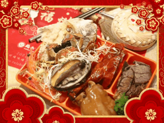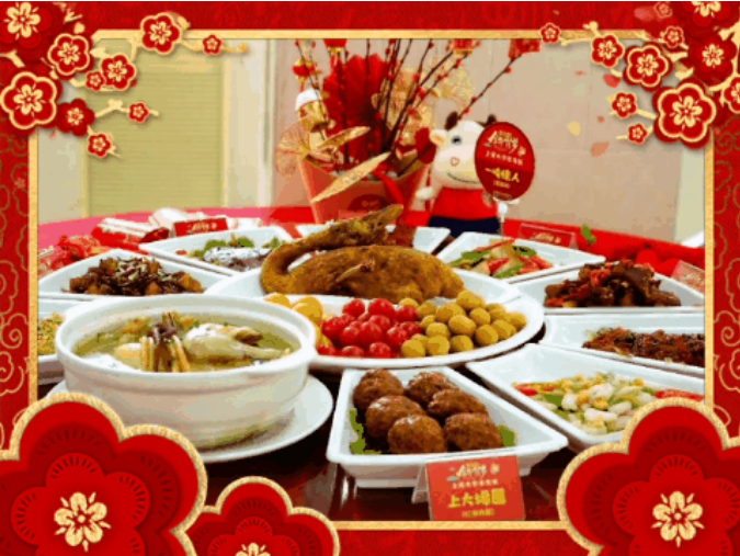 鸿运当头(至尊化皮烧鹅)、喜气洋洋(红烧羊腩煲)、鱼跃龙门(菊花松子鲈鱼)、学业步步高(大闸蟹炒年糕)、金玉满堂(金银蒜蒸元贝)、自助小火锅等。