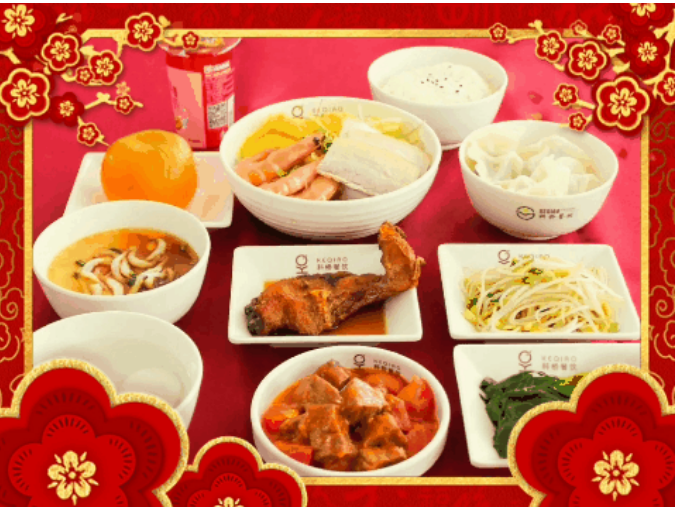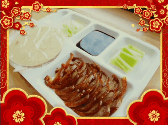 平安顺心套餐(烤鸭单人份+泡菜五花肉)、步步高升(水笋烧肉)、送旧迎新(酱香鸭)、幸福美满(糯米肉团)、五彩缤纷(五彩虾仁)、凤鸣朝阳(辣子鸡)、招财进宝(椒盐虾)、连年有余(剁椒鱼块)、鸿运当头(红烧肉)、越来越牛鸭(烤鸭卷+越南牛肉河粉)等。
