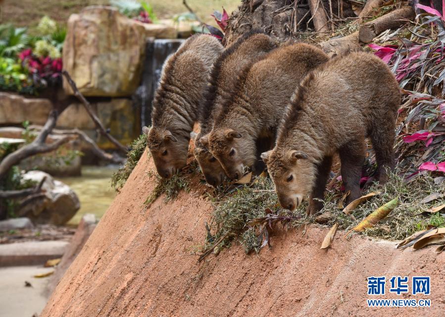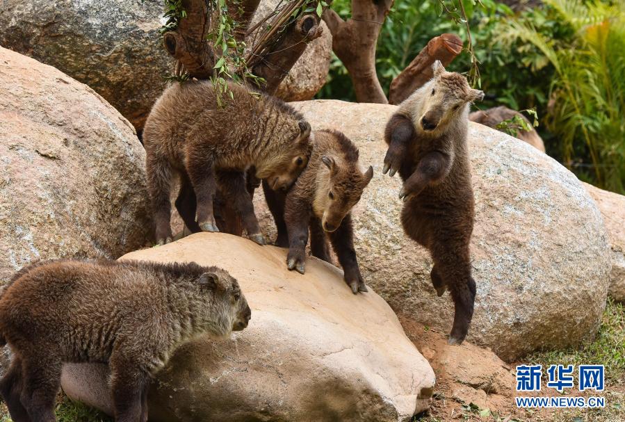 广州长隆野生动物世界的金毛羚牛和幼崽在金牛岭新家玩耍(2月8日摄)。新华社记者 刘大伟 摄