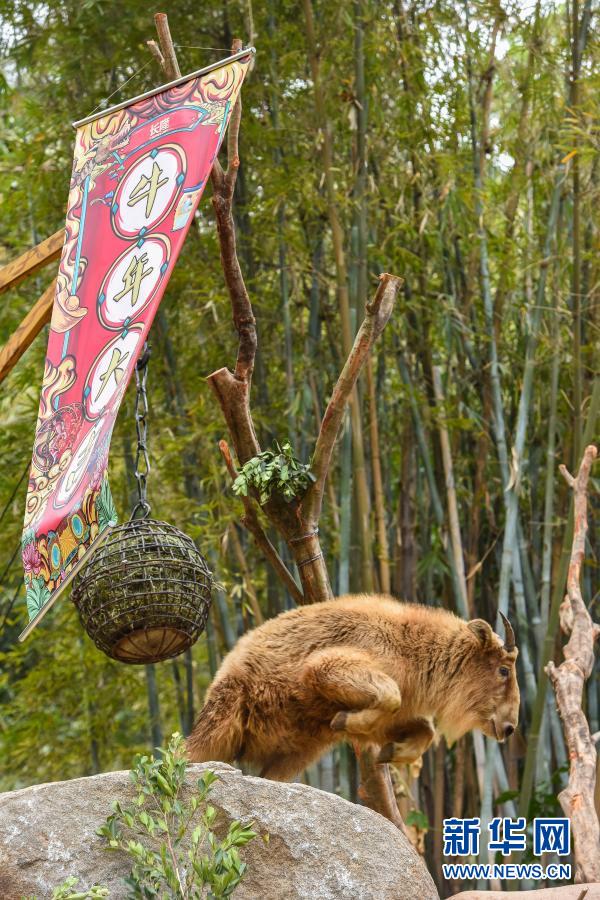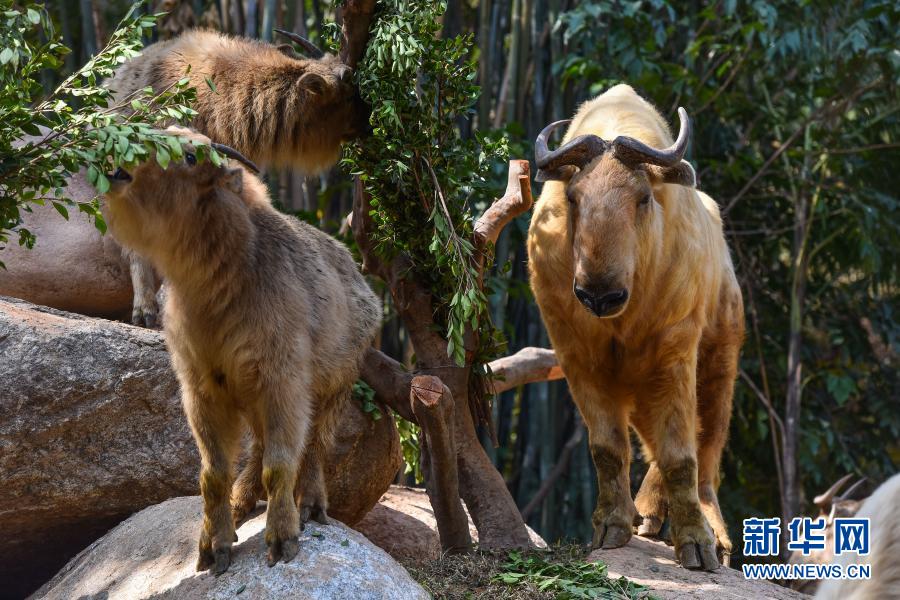 广州长隆野生动物世界的金毛羚牛在金牛岭新家进食(2月8日摄)。新华社记者 刘大伟 摄
