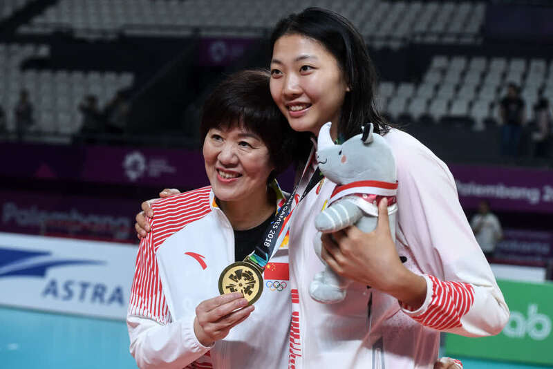 2018年9月1日,中国队主教练郎平(左)与球员袁心玥在在第18届亚运会女子排球颁奖仪式后合影。新华社记者杜宇摄