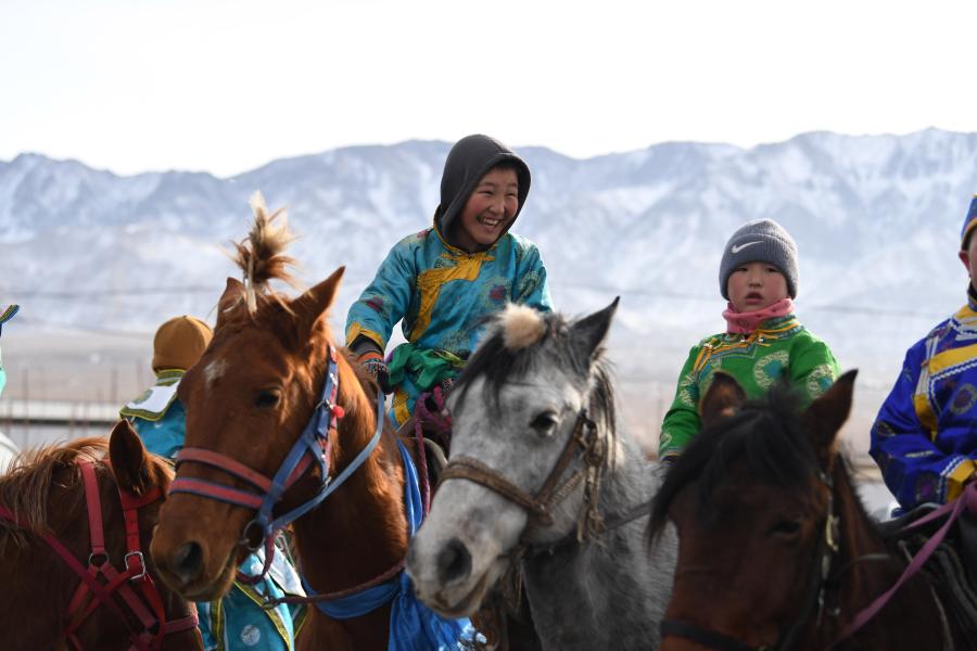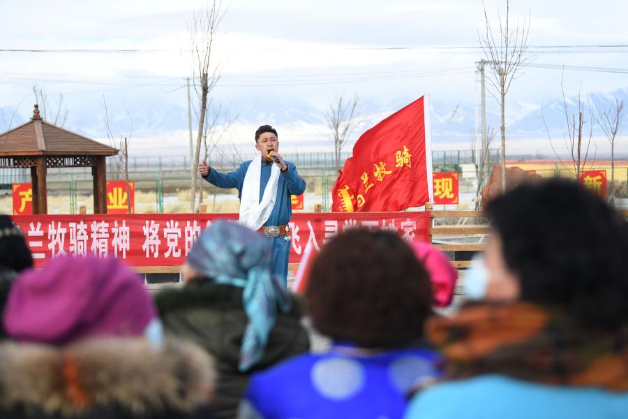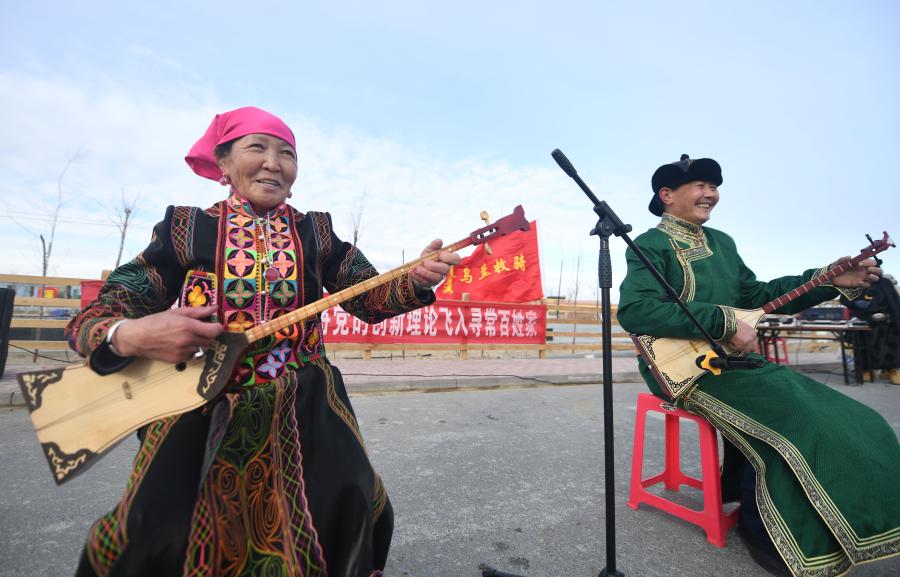 2月11日,乌兰牧骑演员光其加甫在演唱《祝福和布克赛尔》。
