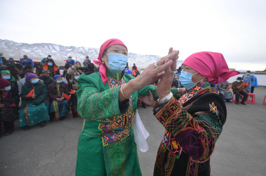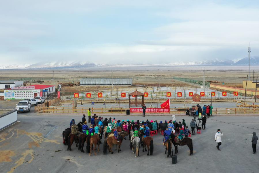 2月11日,农牧民群众在观看乌兰牧骑表演(无人机照片)。