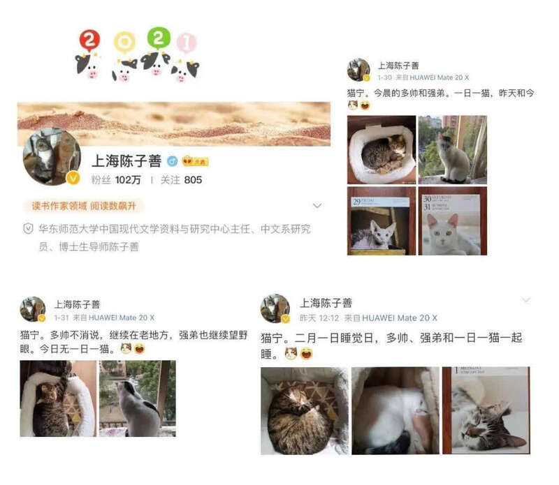 大年三十,华东师范大学中文系教授、博士生导师陈子善率先登场。除了研究工作外,陈子善有两样非常痴迷的爱好:一为书痴,家中藏书数万册,珍本无数;其二为猫痴,养猫三十余载,微博微信头像就是家中的猫咪倩影,每天一早以猫图“猫宁”问候读者和朋友。