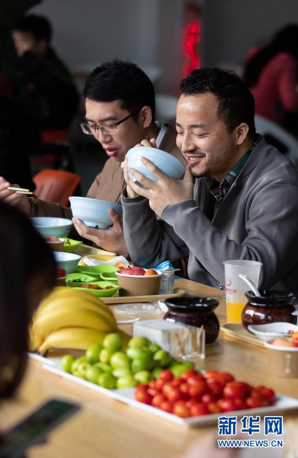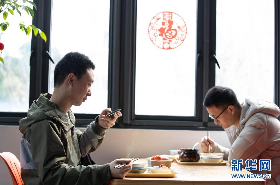2月11日,在四川大学望江校区东二食堂,两位学生在吃午餐。新华社记者 江宏景 摄