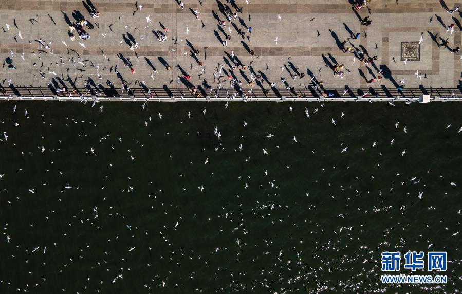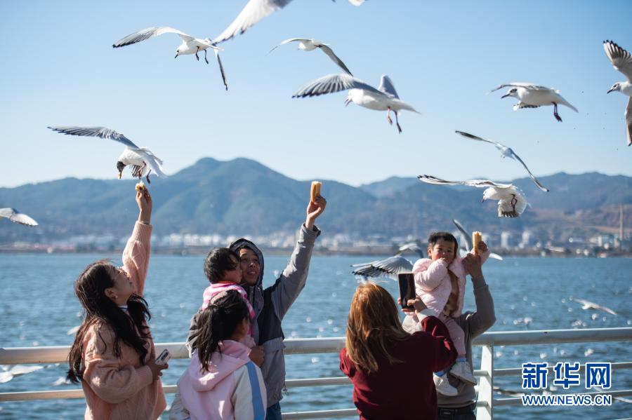 2月11日,游客在昆明海埂大坝给红嘴鸥喂食。新华社记者 王冠森 摄