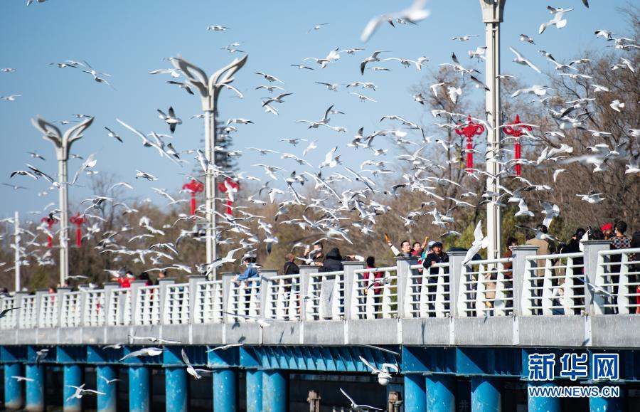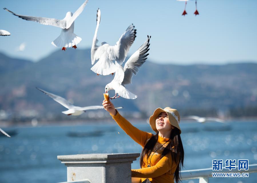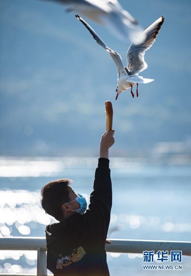 2月11日,游客在昆明海埂大坝给红嘴鸥喂食。当日是农历大年三十,昆明市民与外地游客来到滇池海埂大坝,同红嘴鸥近距离接触,其乐融融,迎接新年。新华社记者 王冠森 摄