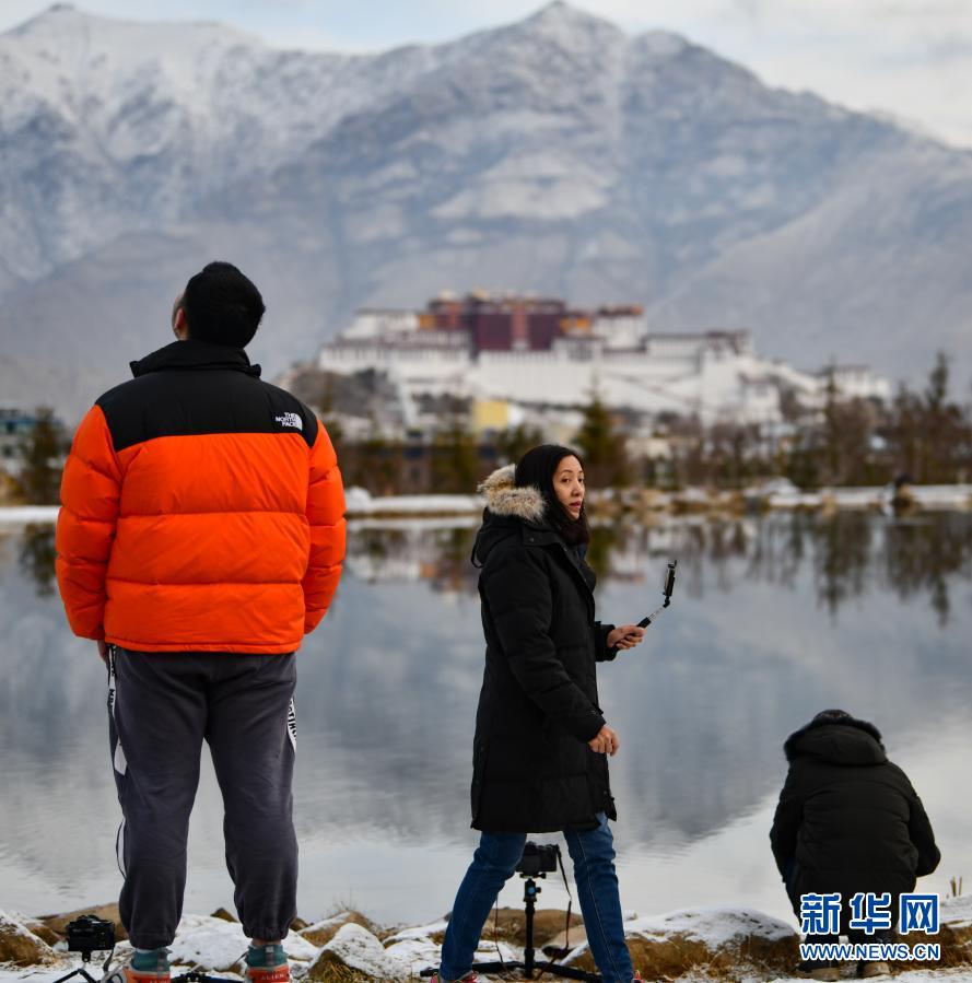 2月11日,几名摄影爱好者在拉萨南山公园拍摄雪景。