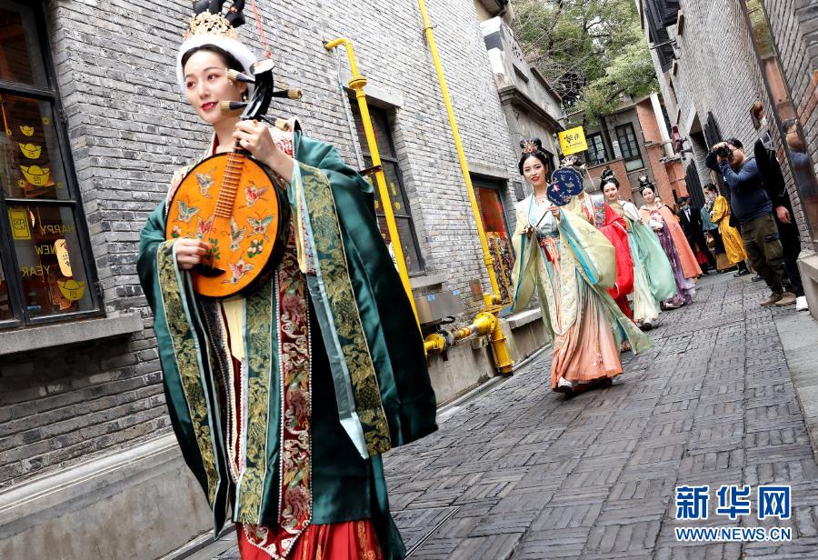 2月12日,一些身穿古典服饰的表演者行走在上海新天地石库门弄堂。新华社记者 陈飞 摄