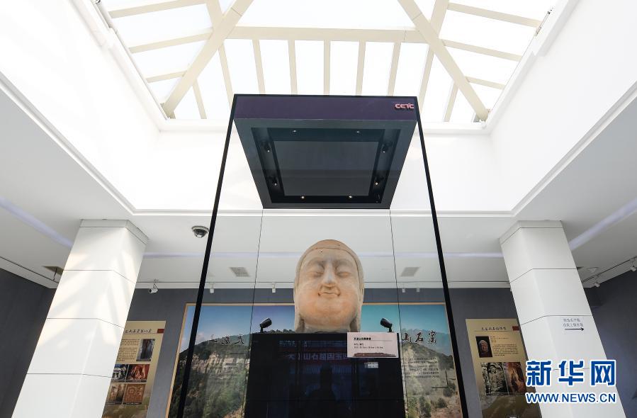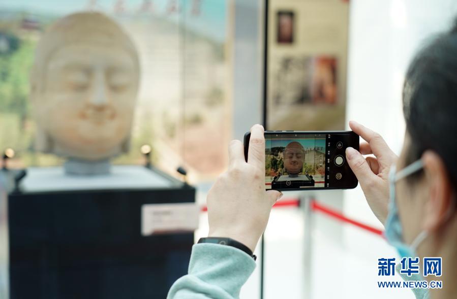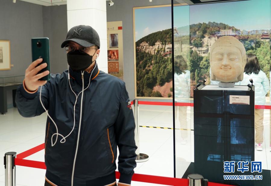 2月12日,参观者在展厅中拍摄展出的天龙山石窟第8窟北壁主尊佛首。
