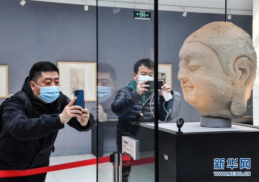 2月12日,在北京鲁迅博物馆,观众拍摄天龙山石窟佛首。