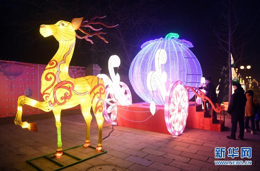 2月13日,市民在北京南宫五洲植物乐园欣赏花灯。