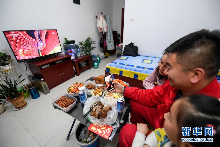 2月11日除夕夜,王涛(中)和妻子女儿在宿舍同在银川的父母和2岁的儿子通视频电话。