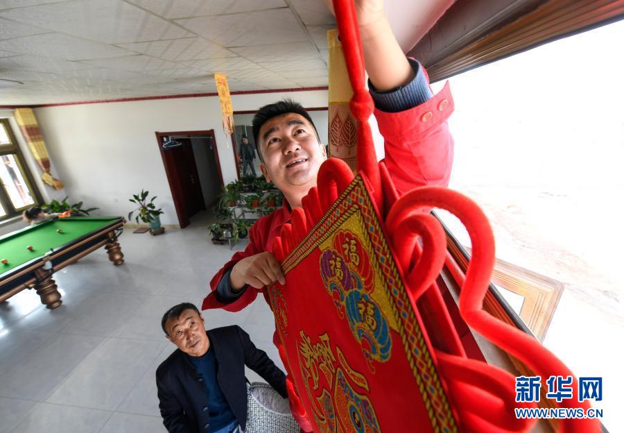 2月11日除夕当天,王涛(右)在为脱贫户刘玉强家挂中国结。