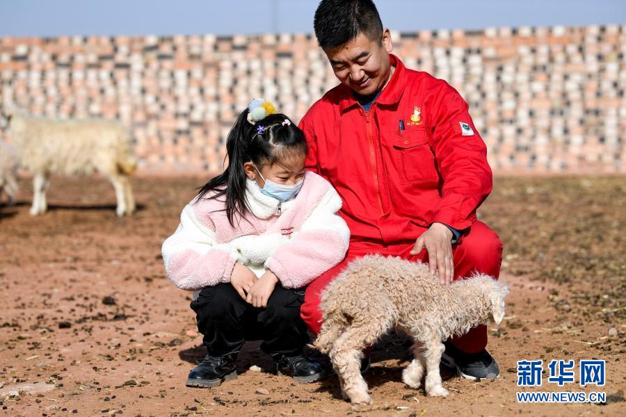 7岁的王思淇第一次来到爸爸王涛驻村的红井子村,她对一切都充满了好奇。这是王涛和王思淇在抚摸一只小羊羔(2月11日摄)。