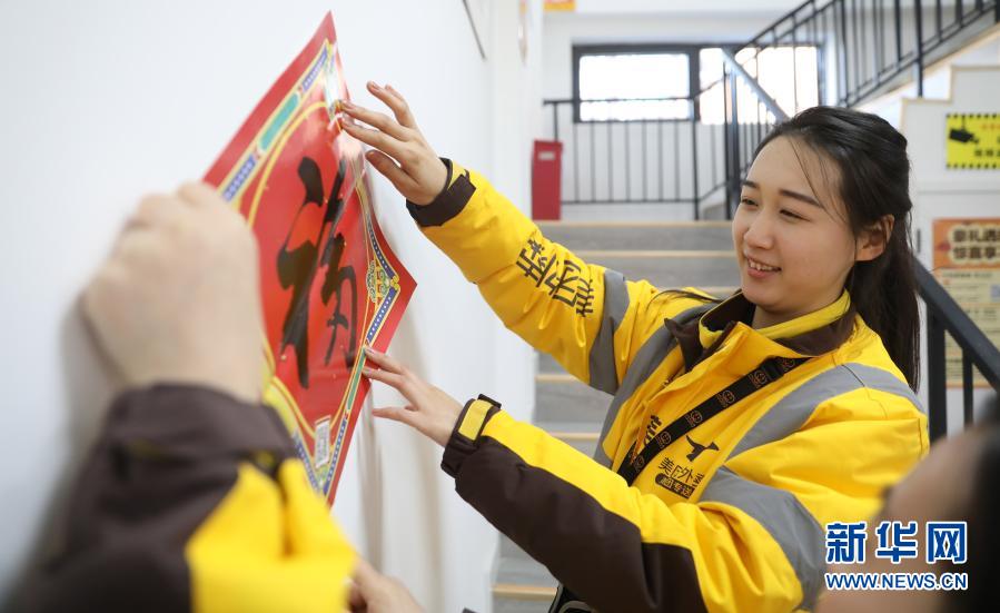 2月10日 ,美团专送骑手小月月在配送站点和同事贴福字。新华社记者 杨青摄