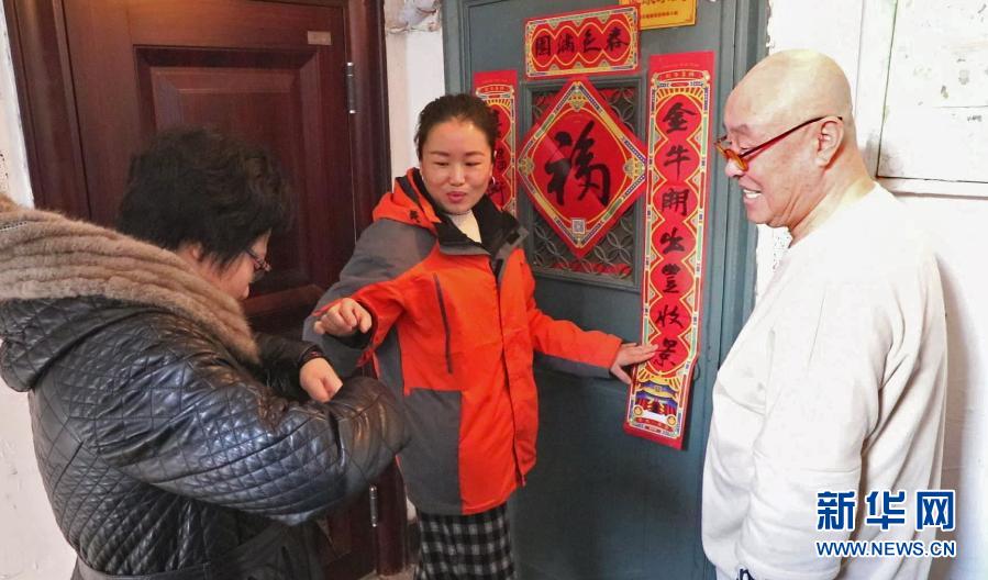 2月10日,社区工作人员为78岁的独居老人郭东辉贴春联。新华社记者 赵泳摄