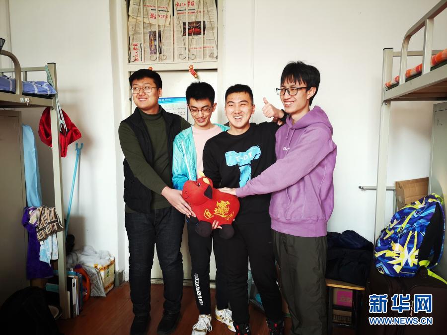 2月11日,东北大学大三学生曹澎骏(右二)和三位临时室友在宿舍过春节。新华社记者 王莹摄