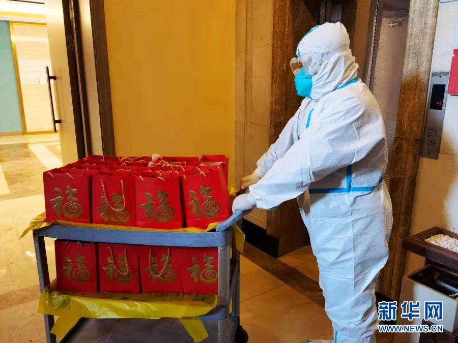 2月11日,在沈阳市铁西区一处隔离安置点,马会昌为每位隔离安置人员送去装有花生、瓜子、榛子等年货的“新春大礼包”。新华社发
