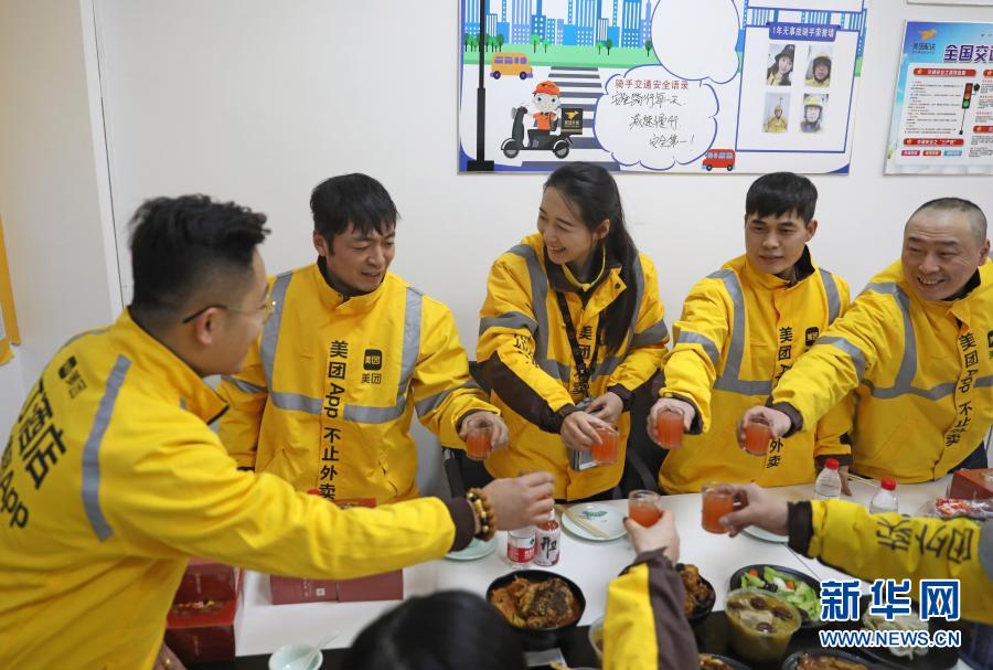 2月10日 ,美团专送骑手小月月(中)和同事在配送站点聚餐过年。新华社记者 杨青摄
