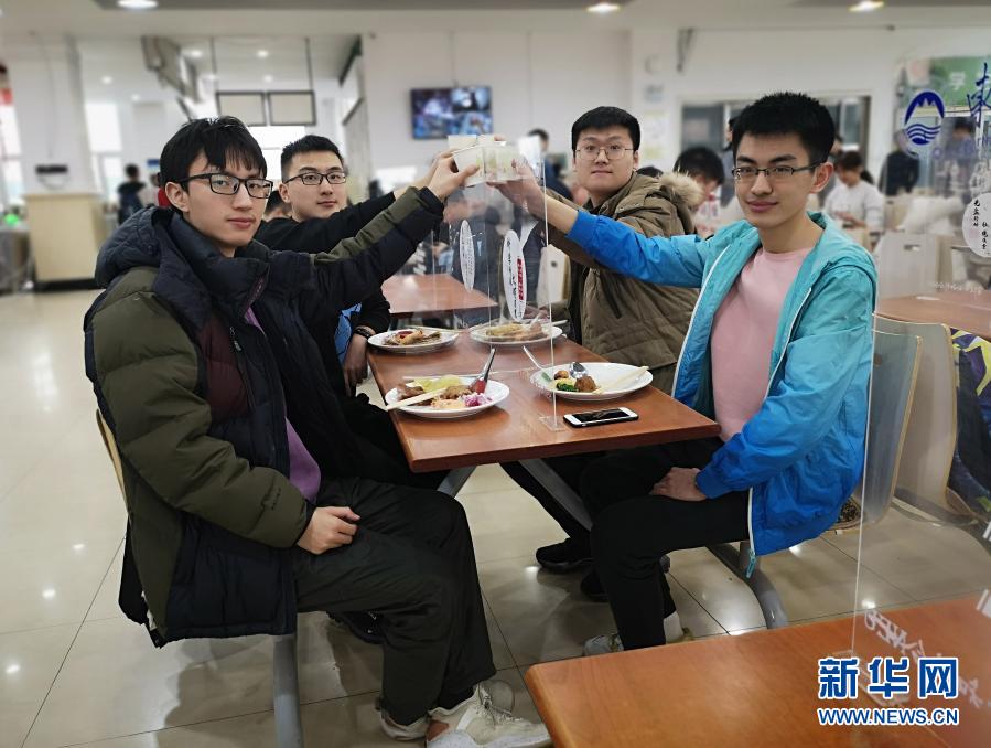 2月11日,东北大学大三学生曹澎骏(左二)和三位临时室友吃着学校准备的年夜饭。新华社记者 王莹摄