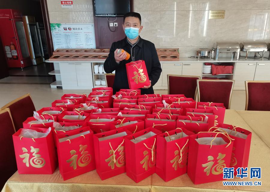 2月10日,在沈阳市铁西区一处隔离安置点,马会昌为每位隔离安置人员准备装有花生、瓜子、榛子等年货的“新春大礼包”。新华社发