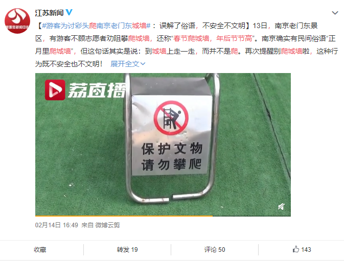 2月13日,南京老门东景区,有游客不顾志愿者劝阻攀爬城墙,还称“春节爬城墙,年后节节高”。南京确实有民间俗语“正月里爬城墙”,但这句话其实是说:到城墙上走一走,而并不是爬。再次提醒别爬城墙啦,这种行为既不安全也不文明!