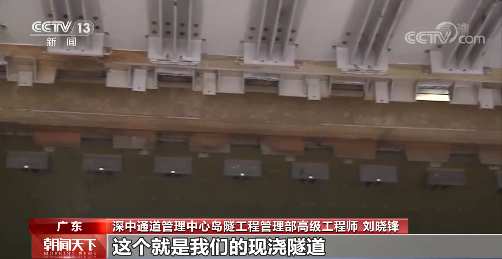 深中通道管理中心岛隧工程管理部高级工程师 刘晓锋: 我们现在所站的位置,就这种浅灰白色的这个就是我们的现浇隧道,这里已经处于海底下了,上面水深这里有十几米了。