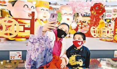 为庆祝中国农历新年,海外许多地方被中国特色春节装饰装点,为当地增添了中国年味。图为游客在加拿大里士满的一处春节装饰物旁自拍。 宋伟仁摄(新华社发)