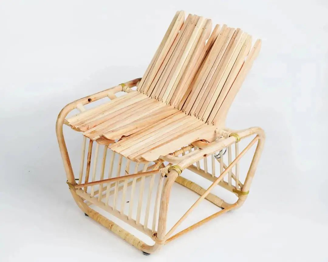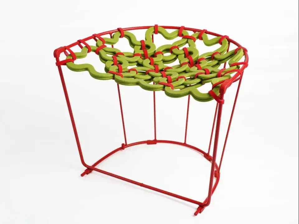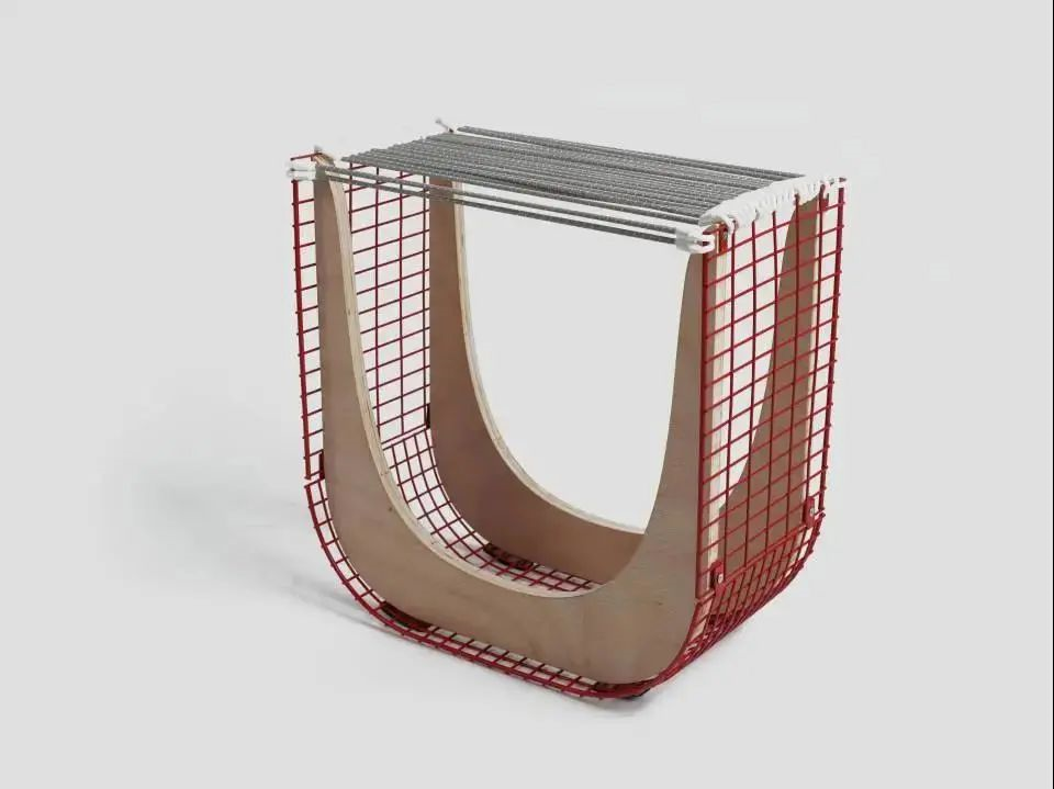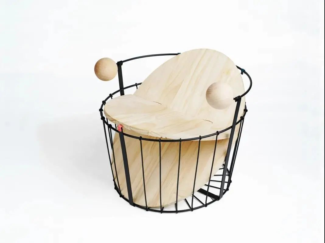 “运用合适的资源,进行戏谑的、挑战性的探索”。为了打破“坐”这一静态的行为,选用弹力绳制成弹性坐面,悬挂在U形铁网上,结构上用胶合板支撑,形成既可以弹又可以摇的凳子,并且造型优美独特,给人留下深刻印象。