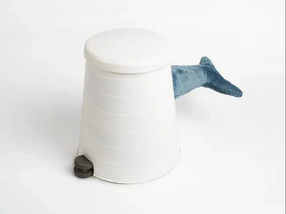 通过垃圾桶踏板和玩具鲨鱼的联动,使生活中抖腿的恼人小习惯放大,转化成鱼尾的动力。同时打破凳子是静态的认知,让它与使用者互动,从而带来惊喜。