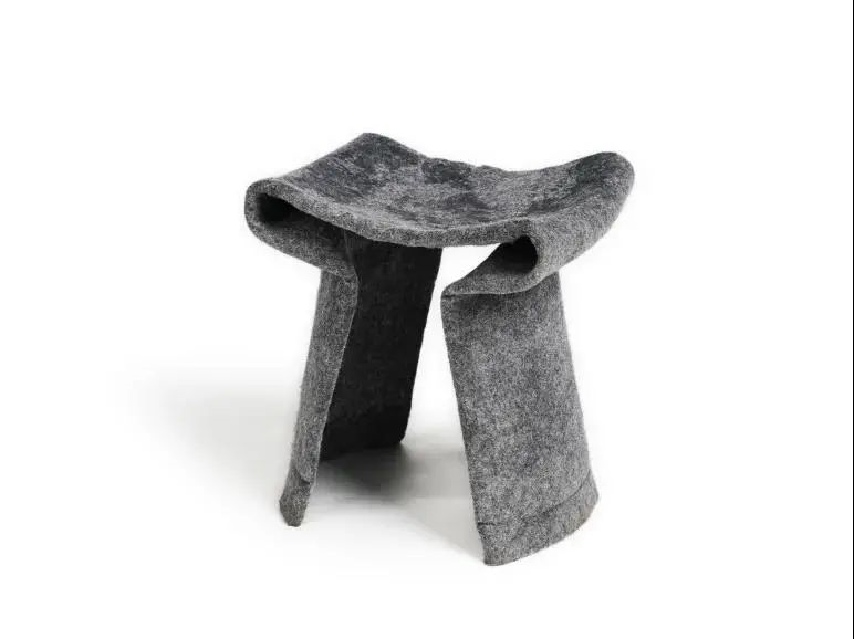 为挑战现有产品的成型方式、挑战视觉和使用的一致性,因此我将宜家的垃圾桶和盘作为凳子成型的模具,覆盖用环氧树脂浸透的毛毡并固化,形成一个看起来软坐起来坚固的凳子。
