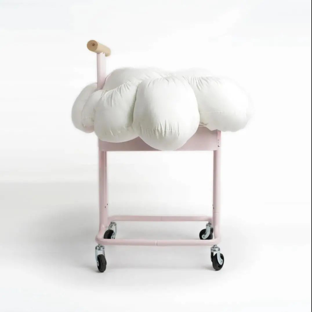 采用宜家推车、床单和枕头,改变了产品的一般常见的形式,让它们具有一种非日常的形态,坐在“一朵云”板凳上,可以自由移动并感受到奇妙的蓬松漂浮感,产生梦幻效果,让人得到更为有趣的使用体验。