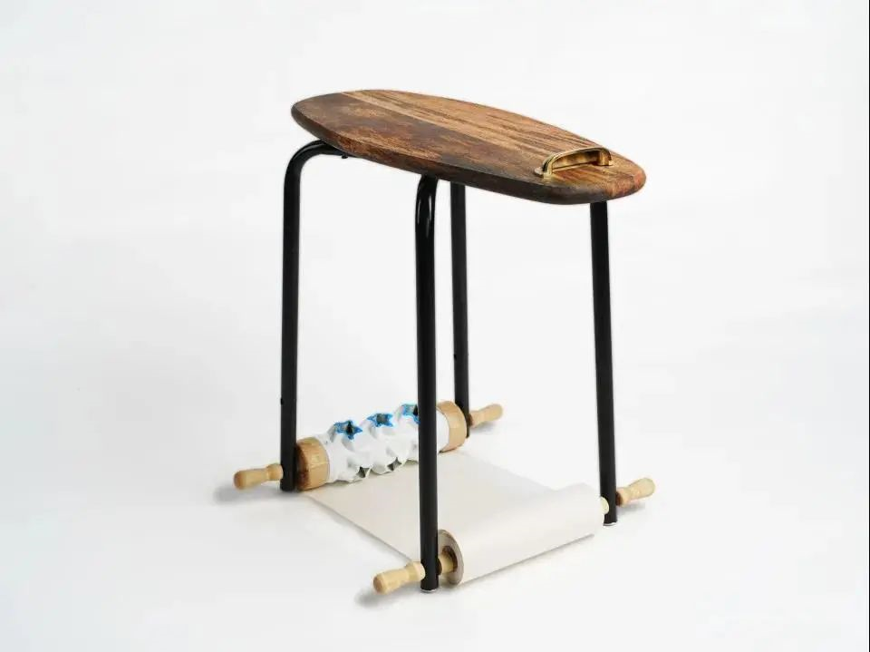 ROLLING STOOL打破了“久坐会使肌肉得不到锻炼”的固有认知。凳身由擀面杖与踏脚凳的支撑结构组成,保留了擀面杖滚动按压的功能,使之与使用者的臀部和腿部肌肉进行交互,实现锻炼按摩的功效。