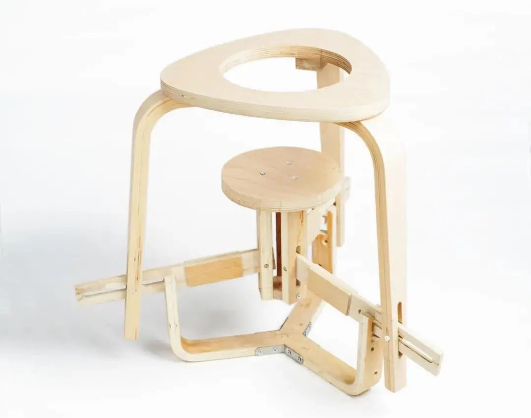 通过杠杆原理制成的一把能够变形、上下活动的凳子。坐在上面的座面上,座面会向下移动,与下方上移的小座面在中间会合,趁你不注意给你一个惊喜(也许是惊吓)。凳子全身由胶合木板制成,其中有少量金属连接件及螺丝。将机械、朋克作为设计语言,以较为复杂的传动结构作为装饰,增加了椅子的机械美感。