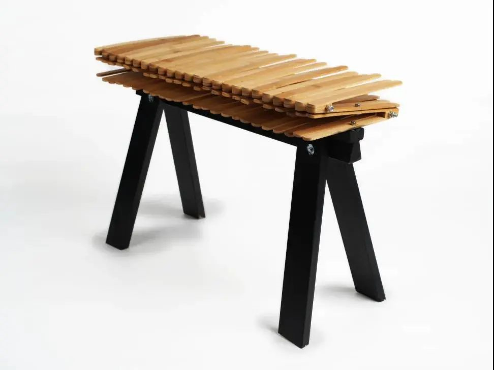 选取上菜夹作为凳面单体,通过层叠与重复的方式构造一个兼具弹性与韧性的坐面。而凳腿选取了支架作为支撑结构,连接部分则使用常见的螺栓、螺帽与螺丝杆,意在体现对简朴生活化中不平凡的追求。人在凳子上体验时既可前后摇摆,也可左右晃动,亦可以在二人坐时创造弹弹的交互。