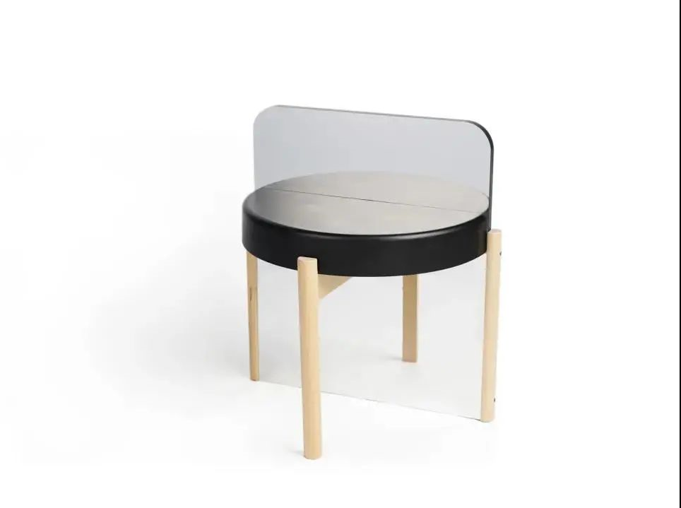 用轻盈的造型做出稳定的结构,用硬质的材料给人舒服的感受。整体采用木材插接的方式实现站立,凳面的夹角是根据人体工学的较为舒适的110°左右,把手的圆球设计采用拟人的语言,给人“邀请”的感觉。